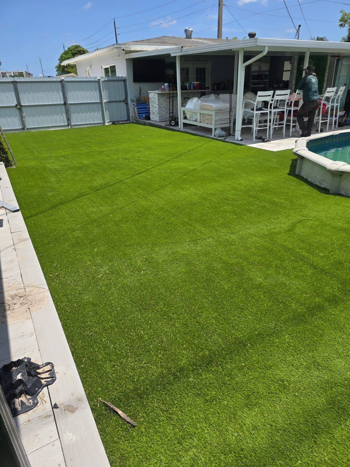 Final Installation. Synthetic grass is placed with precision for a smooth, natural appearance.
